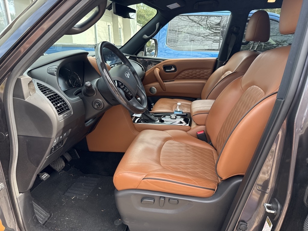 17 Speakers, 2.937 Axle Ratio, 3rd row seats: bench, 4-Wheel Disc Brakes, ABS brakes, Air Conditioning, Alloy wheels, AM/FM radio: SiriusXM, Anti-whiplash front head restraints, Apple CarPlay/Android Auto, Auto High-beam Headlights, Auto tilt-away steering wheel, Auto-dimming door mirrors, Auto-dimming Rear-View mirror, Auto-leveling suspension, Automatic temperature control, Black Painted Mirror Caps, Brake assist, Bumpers: body-color, Cargo Package, Climate Controlled Front Bucket Seats, Compass, Console Net, Dark Chrome Front Fascia Trim, Dark Chrome Grille Surround, Delay-off headlights, Driver door bin, Driver vanity mirror, Dual front impact airbags, Dual front side impact airbags, Electronic Stability Control, Emergency communication system: INFINITI InTouch, First-Aid Kit, Four wheel independent suspension, Front anti-roll bar, Front Bucket Seats, Front Center Armrest, Front dual zone A/C, Front fog lights, Front reading lights, Fully automatic headlights, Garage door transmitter: HomeLink, Heated door mirrors, Heated front seats, Heated rear seats, Heated steering wheel, Illuminated entry, Leather Shift Knob, Leather steering wheel, Literature Kit, Low tire pressure warning, Memory seat, Moisture-Resistant Rear Cargo Carpet, Navigation system: INFINITI InTouch Navigation, Nylon-Cord Cargo Net, Occupant sensing airbag, Outside temperature display, Overhead airbag, Overhead console, Panic alarm, Passenger door bin, Passenger vanity mirror, Perforated Semi-Aniline Leather-Appointed Seats, Power door mirrors, Power driver seat, Power Liftgate, Power moonroof, Power passenger seat, Power steering, Power windows, Radio data system, Radio: Bose Performance Audio System w/17 Speakers, Rain sensing wipers, Rear air conditioning, Rear anti-roll bar, Rear reading lights, Rear seat center armrest, Rear window defroster, Rear window wiper, Reclining 3rd row seat, Remote keyless entry, Roof Rail Cross Bars, Security system, Sensory Dark Chrome Appearance Package, Speed control, Speed-sensing steering, Split folding rear seat, Spoiler, Steering wheel memory, Steering wheel mounted audio controls, Tachometer, Telescoping steering wheel, Tilt steering wheel, Traction control, Trip computer, Turn signal indicator mirrors, Variably intermittent wipers, Ventilated front seats, Voltmeter, Wheels: 22" Dark Chrome Cast Aluminum-Alloy.